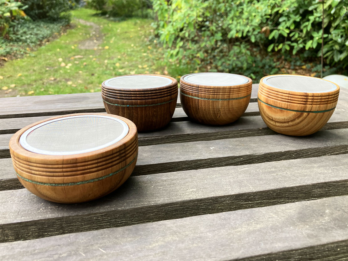 Die von Hand gedrechselten Räucherschalen werden liebevoll aus edlen zum Teil seltenen Hölzern gefertigt. So gibt es z.B. Red Cedar, Atlas Zeder, Thuja, Erle, Birke, Walnuss, Eberesche oder Apfelholz. Jede ist ein ganz besonderes Einzelstück - vor allem mit einem eingearbeiteten Inlay- Ring aus Türkis, Malachit oder anderen Halbedelsteinen.